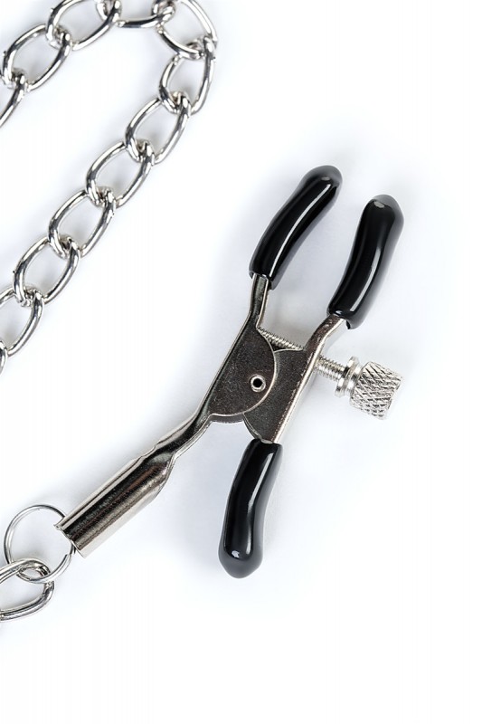 К кляпу при помощи металлических цепочек присоединены зажимы для сосков. Зажимы регулируемые, что позволяет самостоятельно регулировать степень сжатия. Силиконовые наконечники идеальны для самых комфортных ласк, т.к. не натирают и не царапают нежнейшую кожу